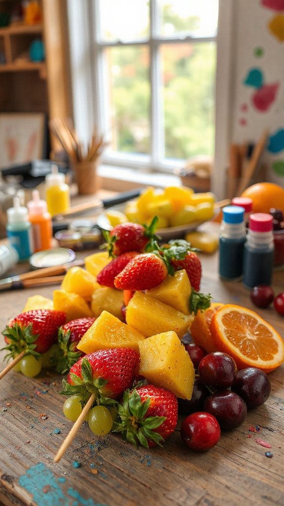 - Once all the skewers are filled with fruit, arrange them on a platter and serve immediately or refrigerate for later enjoyment! Enjoy this vibrant snack during your art endeavors!