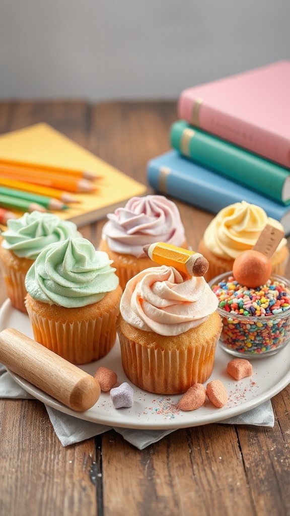 - Stack two or three frosted cupcakes together to mimic a stack of books, using candies for the spines and optionally sprinkle some edible glitter for extra flair.