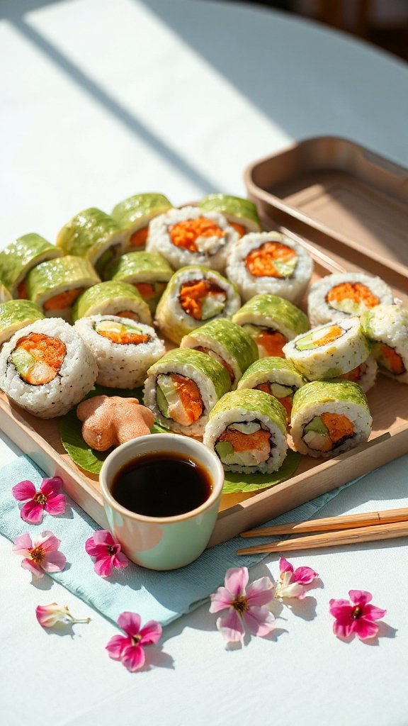 6. Slice the roll into bite-sized pieces and serve with soy sauce. Enjoy your Veggie Sushi Wraps!