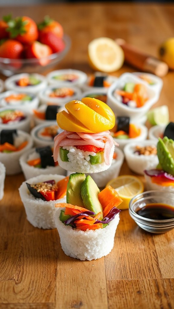Rainbow Sushi Cups are a vibrant and playful twist on traditional sushi, perfect for lunchboxes! These colorful cups are made by layering a variety of fresh veggies, protein, and sushi rice in a cup or small bowl, creating a visually appealing, nutritious, and easy-to-eat option for kids. With their bright colors and delightful flavors, Rainbow Sushi Cups make lunchtime exciting!