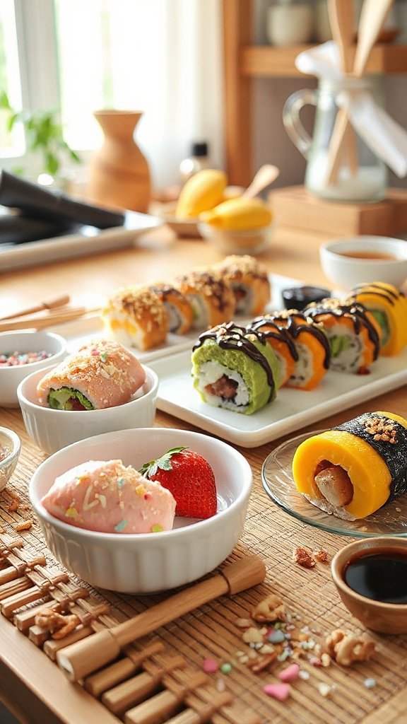 7. Slice the roll into bite-sized pieces and serve with coconut flakes sprinkled on top, if desired. Enjoy your Fruit Sushi Delights!