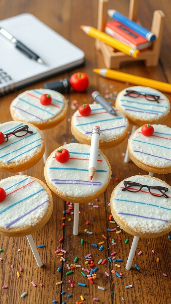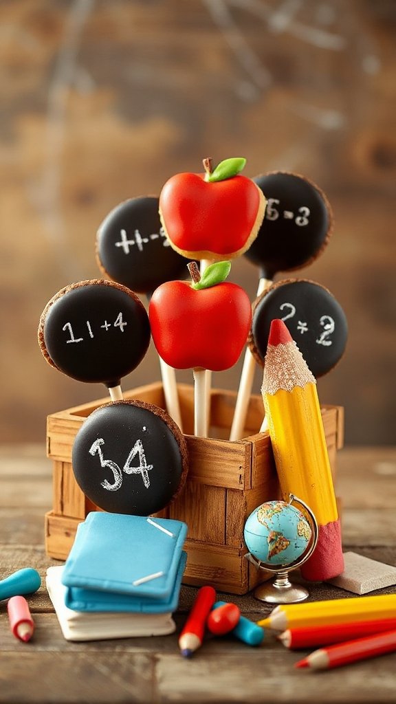 - Once cooled, coat the cookie pops with dark chocolate or black icing to mimic a chalkboard.