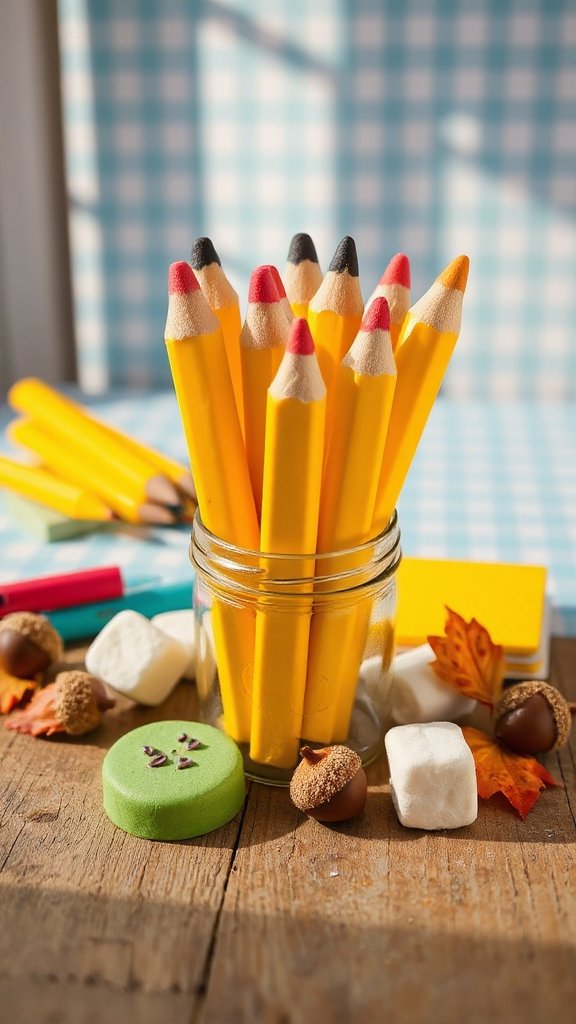 - Once cooled, dip the tapered ends in melted yellow candy coating or chocolate to resemble the pencil tip, then use black icing or chocolate chips to add the pencil details and optional sprinkles for decoration.