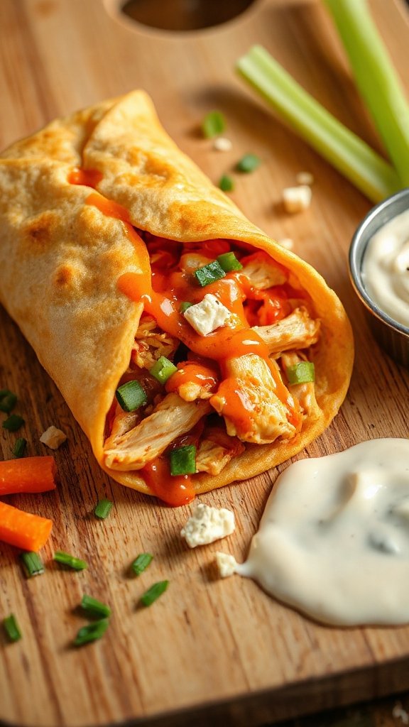 3. Lay out a tortilla wrap, add a portion of the buffalo chicken mixture in the center, and roll it up tightly to enclose the filling.
