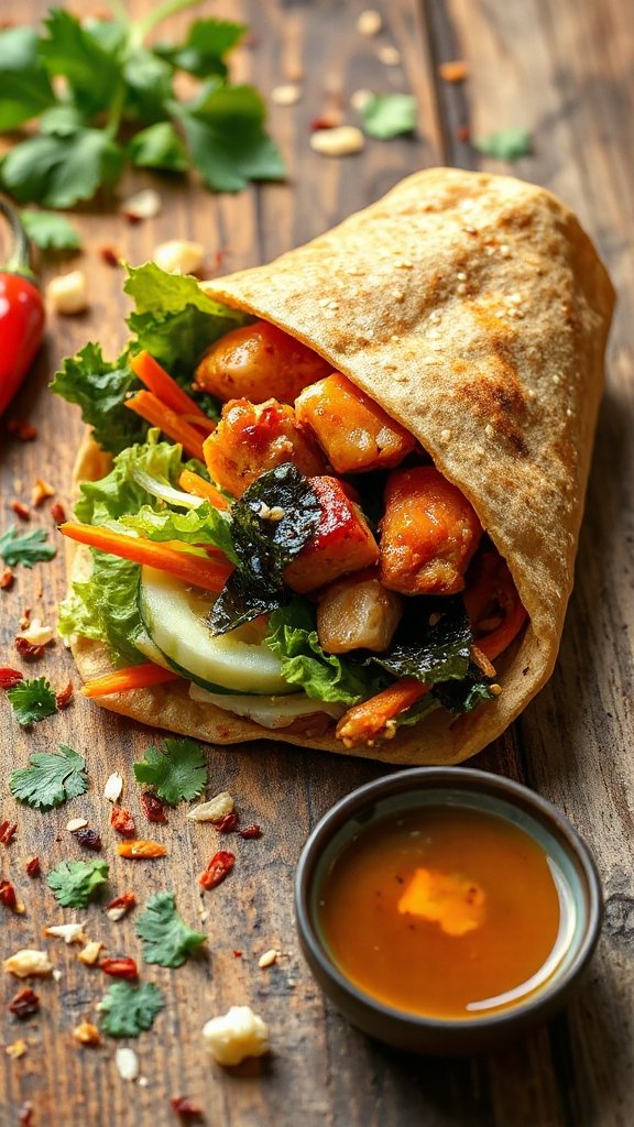 4. If desired, drizzle with olive oil and sprinkle with sesame seeds before serving. Enjoy your flavorful Teriyaki Chicken and Veggie Wrap!