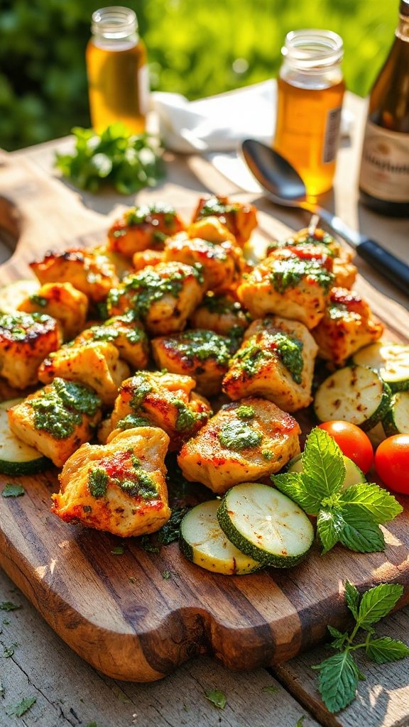 - Grill the skewers for 10-12 minutes, turning occasionally, until the chicken is cooked through and the zucchini is tender.