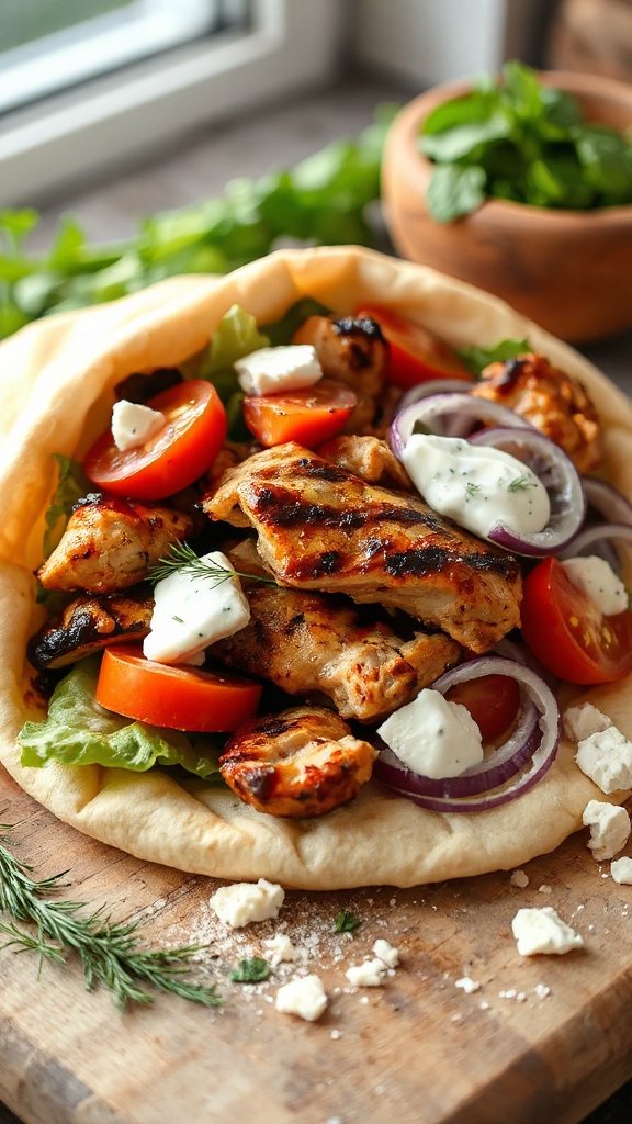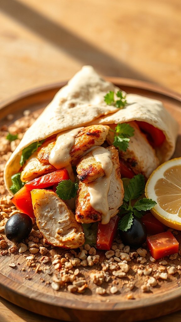 The Mediterranean Grilled Chicken Wrap is a fresh and flavorful dish that brings the tastes of the Mediterranean to your fingertips. This wrap combines juicy grilled chicken marinated in zesty herbs and spices, with vibrant veggies like tomatoes, cucumbers, and red onions, all enveloped in a warm, soft tortilla. A drizzle of creamy tzatziki sauce adds a delicious touch, making it a perfect option for a light lunch or a fulfilling dinner.