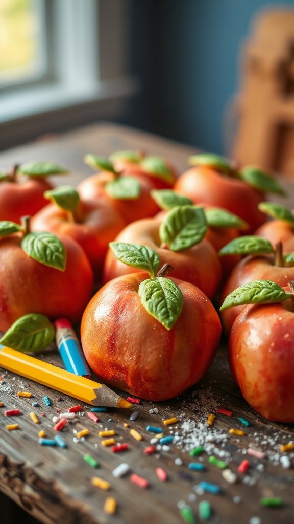 - Shape the red dough into apple-like shapes and attach a small piece of green dough as a leaf.