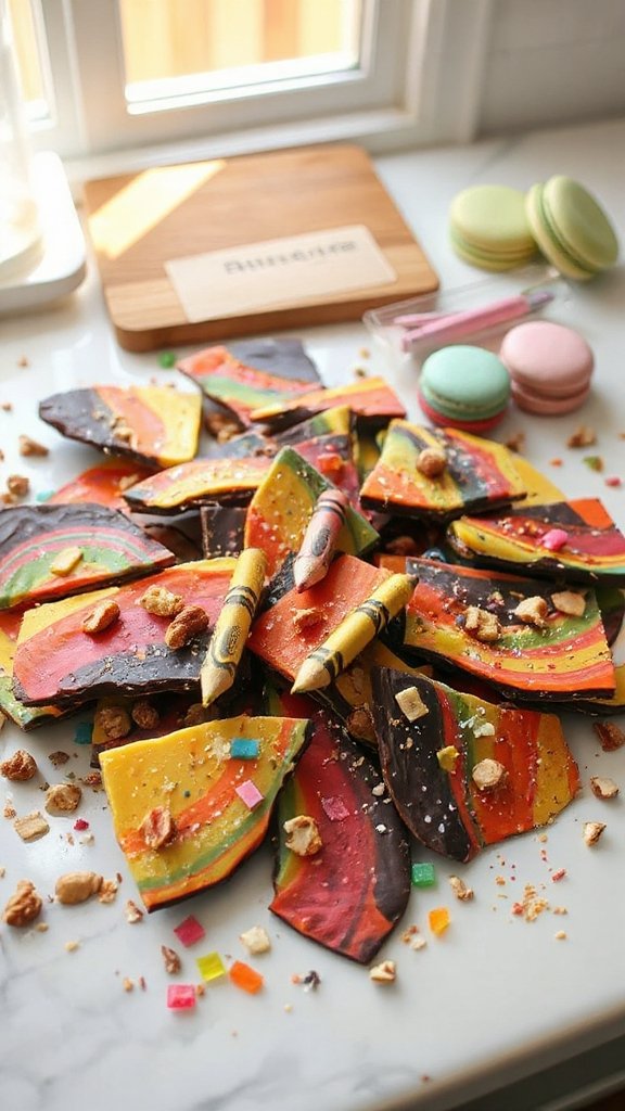 - Spread the colored chocolate onto a parchment-lined baking sheet, creating a layered crayon effect.