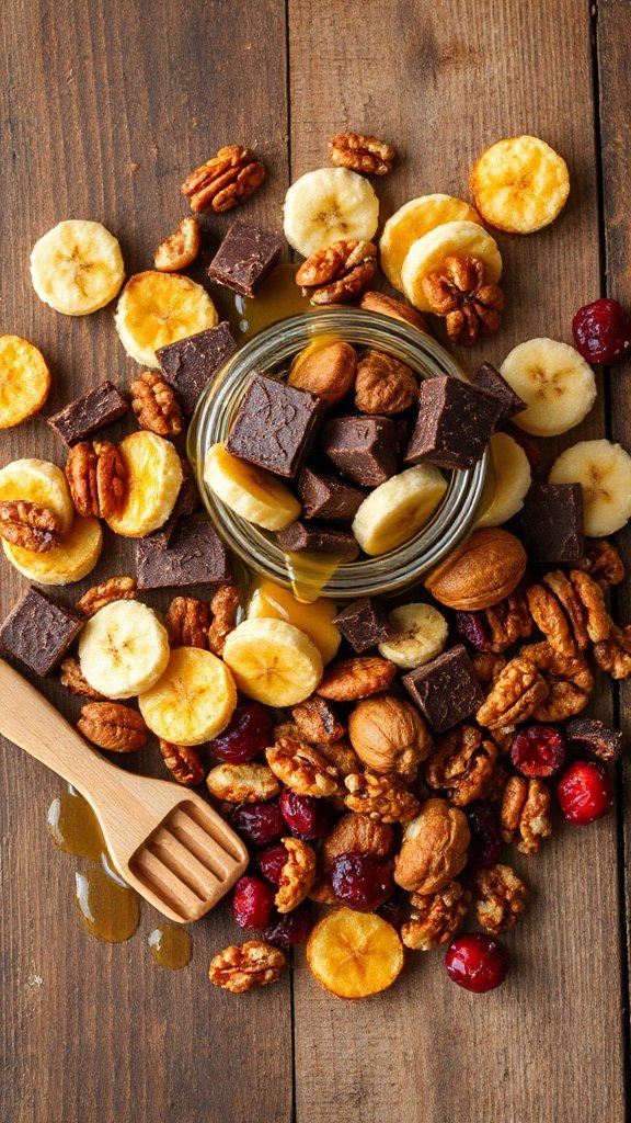 - In a large mixing bowl, combine the dried banana chips, dark chocolate chips, walnuts, almonds, and honey-roasted peanuts.