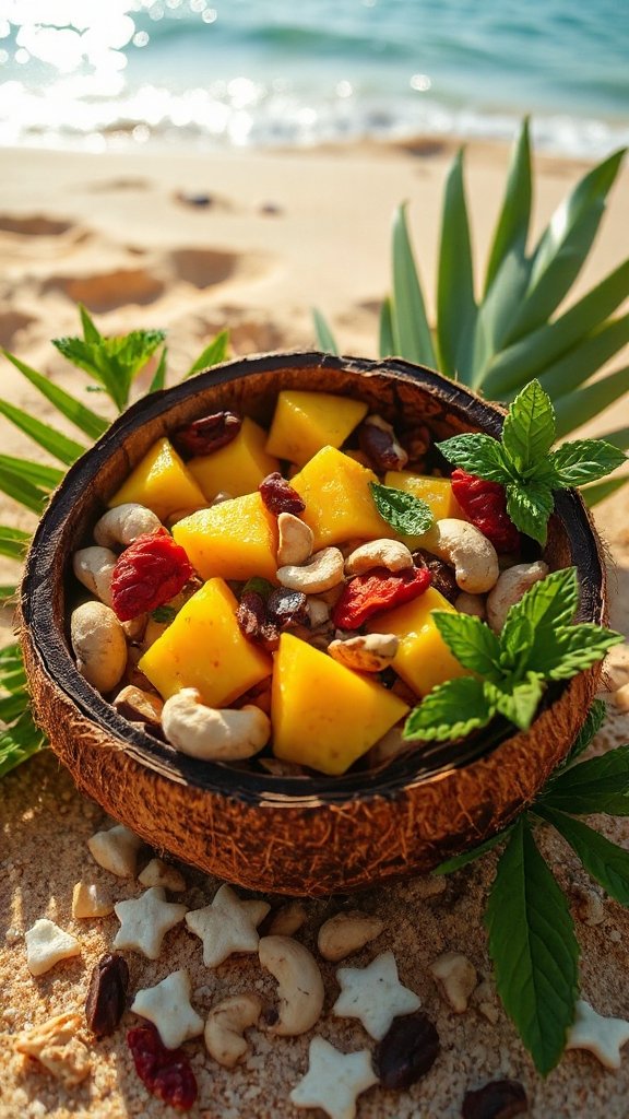 - In a large mixing bowl, combine the dried pineapple chunks, dried mango slices, cashews, coconut flakes, and macadamia nuts.