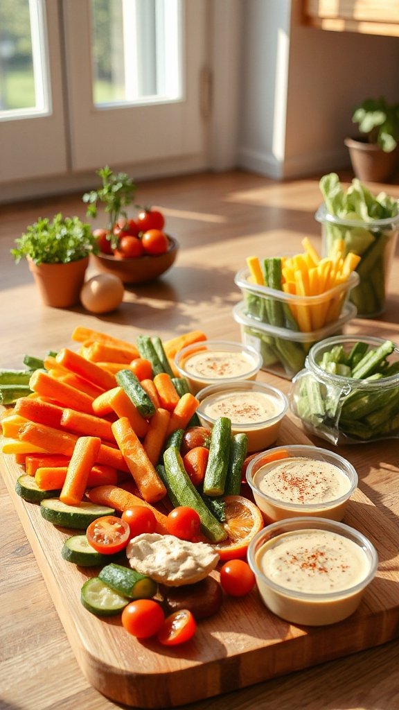 - Arrange the prepared vegetables in snack-sized containers or bento boxes with a portion of hummus.