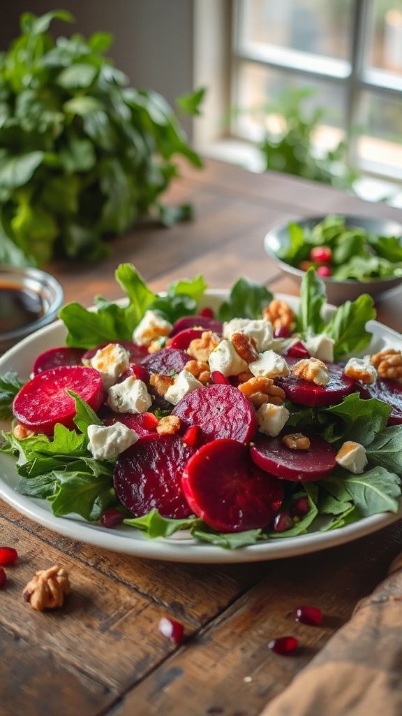 2. In a large bowl, combine the roasted beets with arugula or mixed greens, crumbled goat cheese, and chopped walnuts.