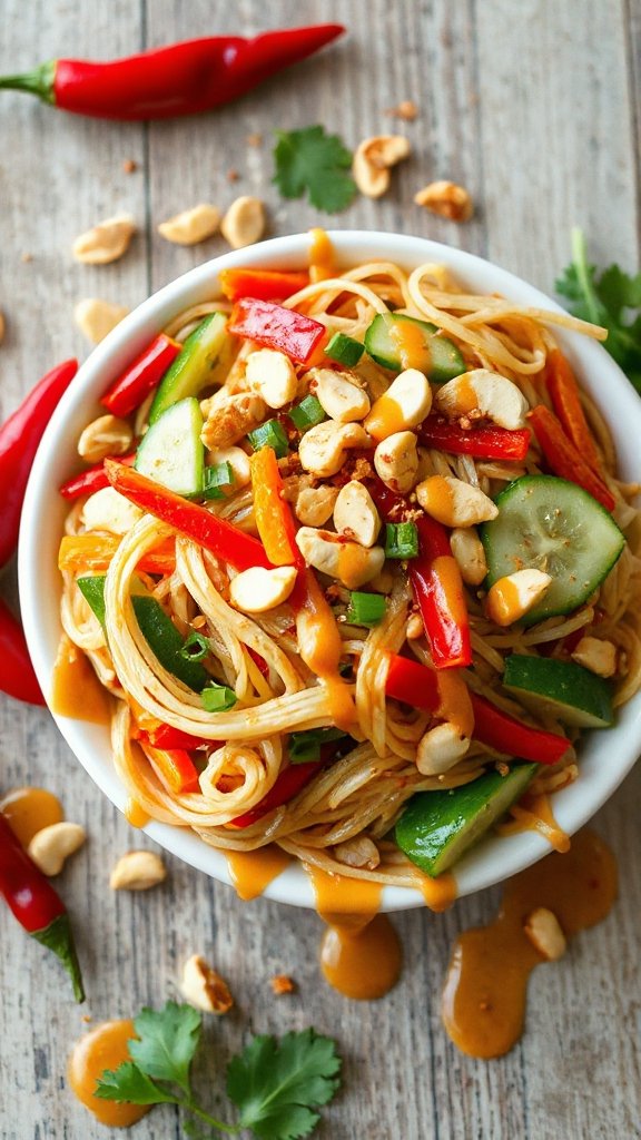 Spicy Thai Noodle Salad with Peanuts is a vibrant and flavorful dish that combines the crispness of vegetables with the savory, spicy notes typical of Thai cuisine. This salad features rice noodles tossed with colorful vegetables and a zesty dressing, topped off with crunchy peanuts for an extra layer of texture. It’s a wonderful choice for a light lunch or a revitalizing side dish at a gathering.