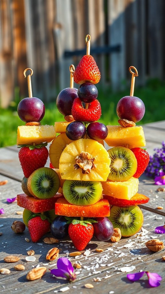 2. Assemble Kabobs: On each skewer, alternate threading pieces of fruit with almonds and walnuts to create colorful and nutty combinations.