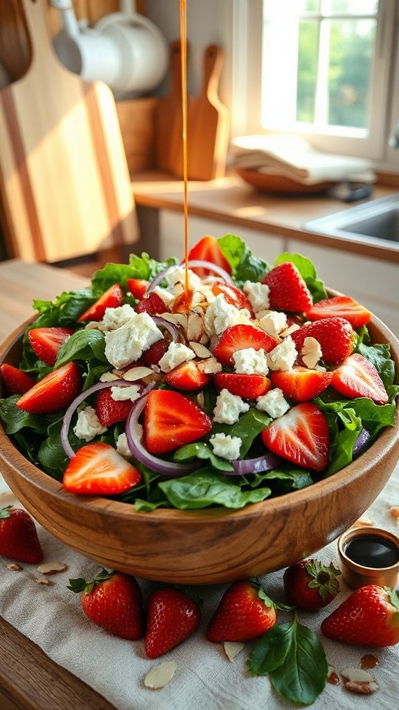 - In a large bowl, combine the mixed greens, sliced strawberries, walnuts, and crumbled feta cheese.