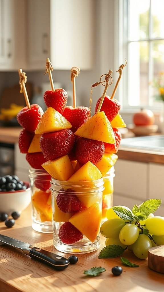 - Repeat the process until all skewers are assembled, filling each with a mix of strawberries, pineapple, grapes, melon, and banana.