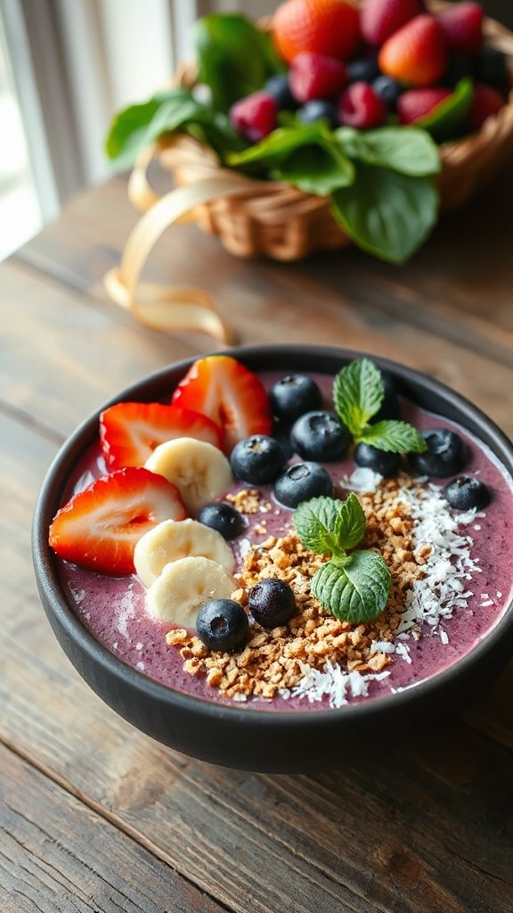 - Top with granola, fresh berries, sliced banana, nuts, and coconut flakes.