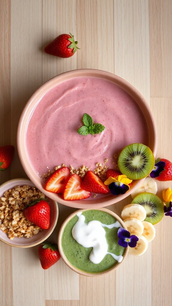 The Strawberry Kiwi Cooler is a revitalizing and nutritious smoothie bowl that is perfect for a quick breakfast or a lively snack. Bursting with the natural sweetness of strawberries and the zesty tang of kiwi, this bowl is not only delicious but also packed with vitamins. Topped with fresh fruits and a sprinkle of granola, it’s a delightful way to kick-start your day.