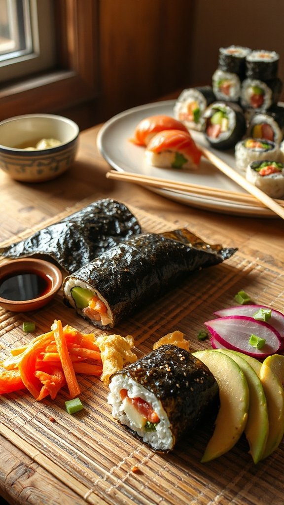 - Pack the sushi rolls in a container with soy sauce, pickled ginger, and wasabi for a delicious lunch!