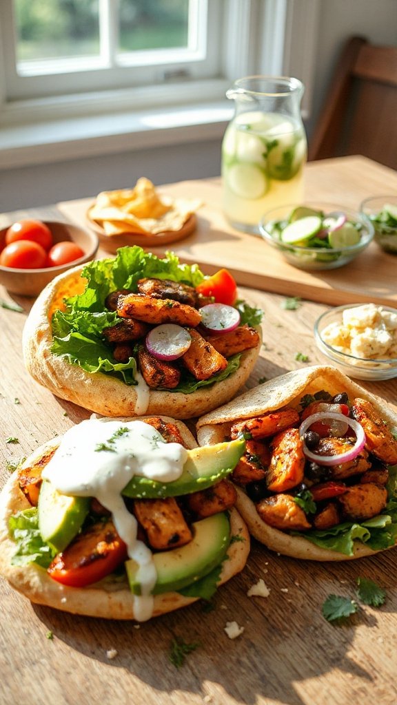 - Fill each pocket with shredded chicken, cucumber slices, cherry tomatoes, red onion, and mixed salad greens.