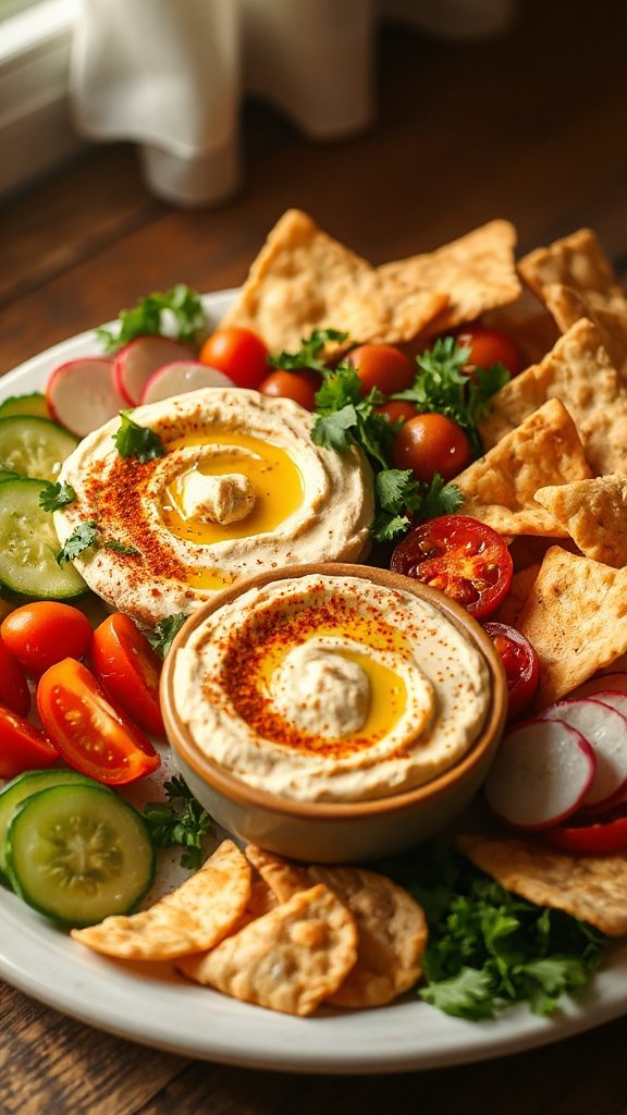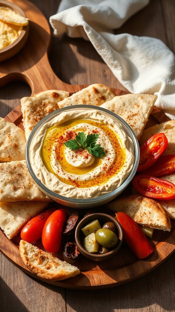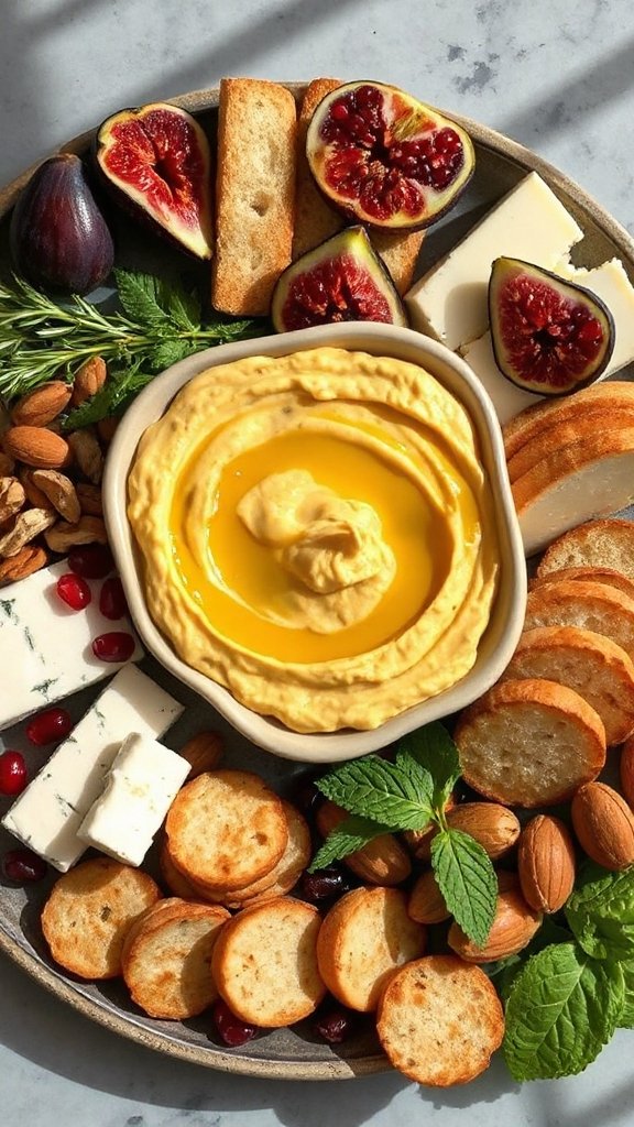A cheese platter is a delightful and versatile dish that can be enjoyed as an appetizer or party snack. It combines a variety of cheeses, fruits, nuts, and crackers, making it an appealing visual centerpiece that pairs wonderfully with hummus. The creaminess of the cheeses and the tangy flavors in the hummus create a satisfying tasting experience.