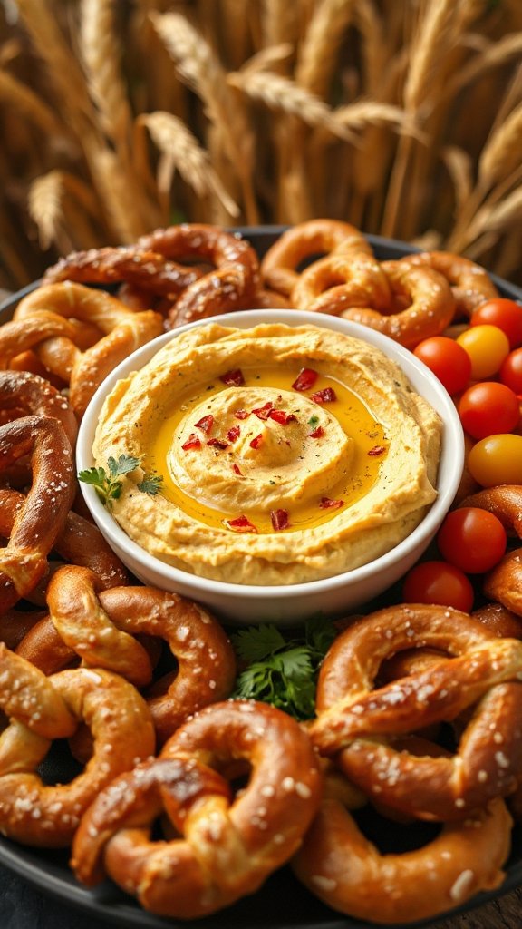 - Serve the hummus in a small dish alongside the pretzels for dipping.