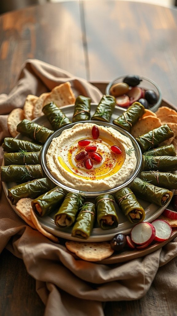 Stuffed grape leaves, also known as dolmas, are a classic Mediterranean dish that combines fresh grape leaves with a flavorful filling, typically made from rice, herbs, and spices. They are often served as an appetizer or side dish and pair wonderfully with hummus, providing a complementary texture and taste that enhances the overall dining experience.