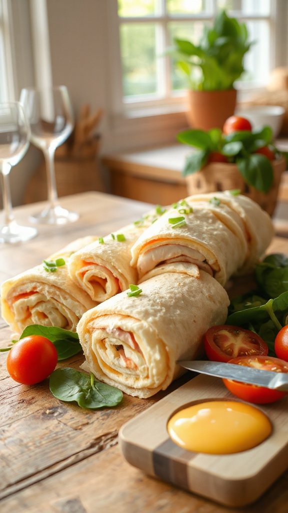 4. Place a portion of the egg mixture onto each tortilla and roll tightly, folding in the ends to secure the filling.