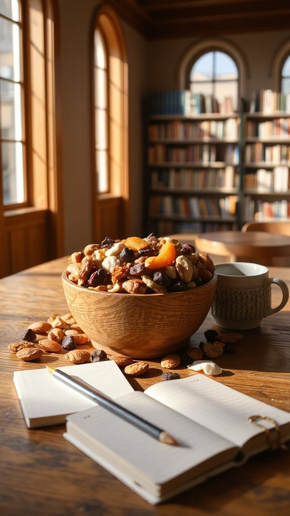 Trail mix is a delicious and highly customizable snack that’s perfect for keeping you energized and focused during long study sessions. Ideal for a library environment, this quiet snack combines a variety of textures and flavors, making it not only satisfying but also packed with nutrients. Whether you’re in the mood for something sweet, salty, or crunchy, you can mix and match your favorite ingredients to create the perfect blend.