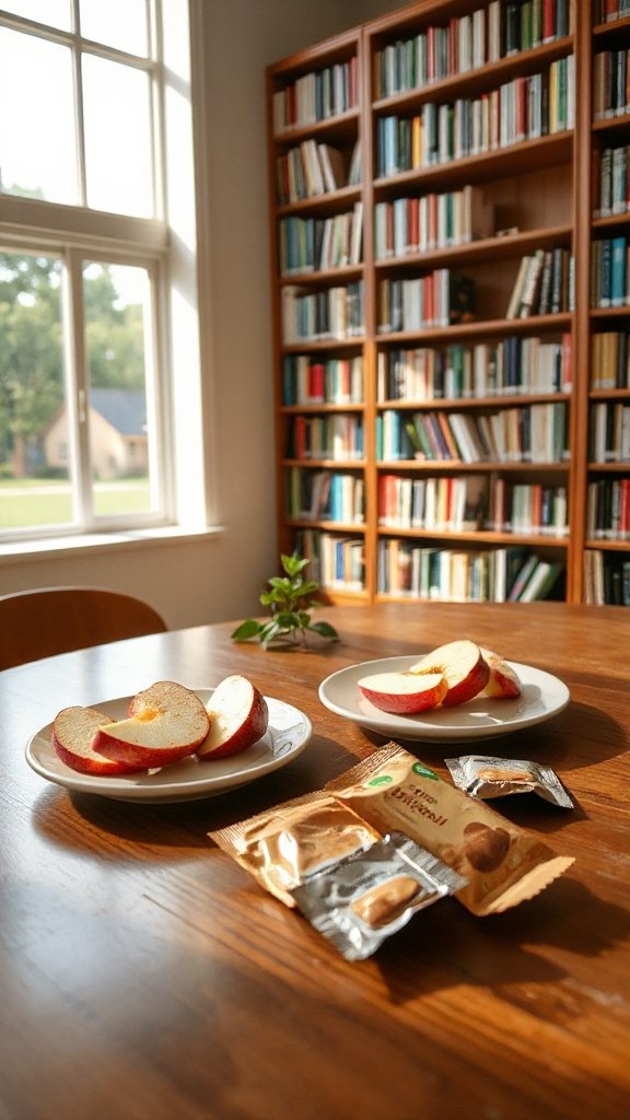 Nut butter packs with apple slices make for a perfect library-quiet snack that is both nutritious and easy to prepare. This wholesome treat combines the crisp, natural sweetness of fresh apple slices with the creamy richness of your choice of nut butter. Ideal for study halls, these snacks are not only delicious but also provide a good source of energy to keep you focused and alert during long study sessions.