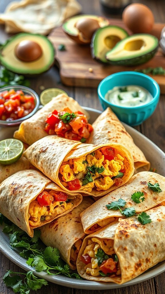- Lay out the tortillas, and divide the egg mixture evenly on each. Roll the tortillas tightly, folding in the sides to prevent filling from spilling out.