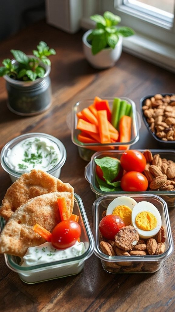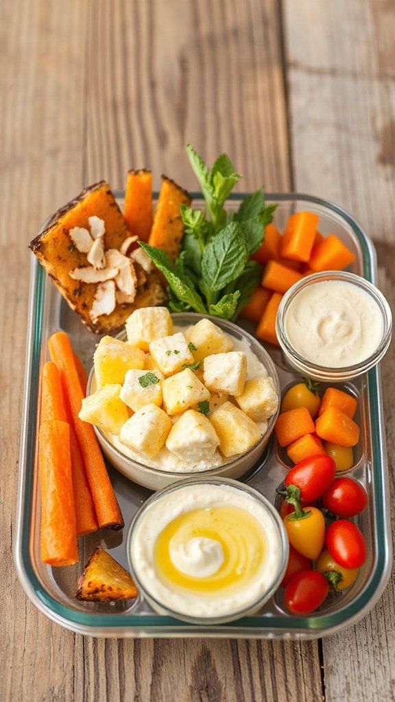 - Arrange the chicken, hummus, and assorted vegetables in separate compartments of a meal prep container.