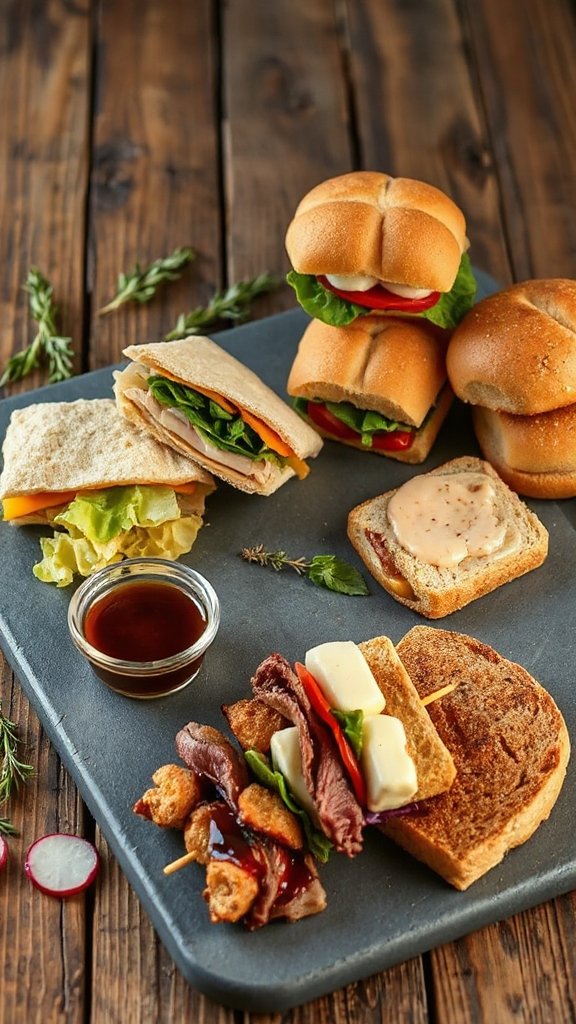 - Assemble Mini Sandwiches or Wraps: Layer deli meats, cheese, lettuce, tomato, and any additional toppings on each slice of bread or tortilla. Spread mayonnaise or mustard as desired.
