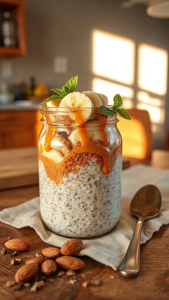 - In the morning, top with sliced banana and nuts if desired, then stir and enjoy your energizing Matcha Green Tea Overnight Oats!