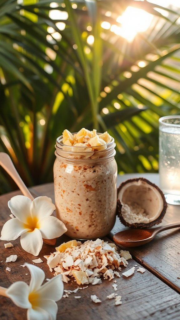 - In the morning, stir the mixture and top with sliced banana (if desired) before enjoying your Tropical Coconut Pineapple Overnight Oats!