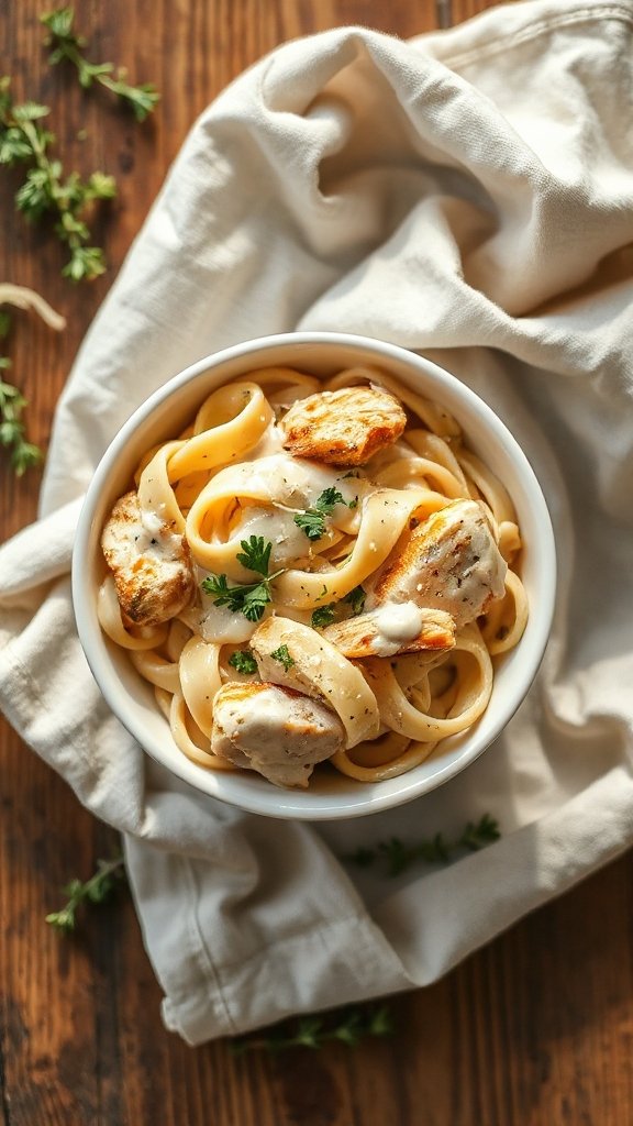 - Combine cooked pasta and diced chicken with the Alfredo sauce until evenly coated.