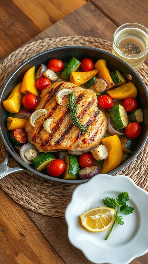 4. Arrange the sliced zucchini, chopped bell pepper, and cherry tomatoes around the chicken.