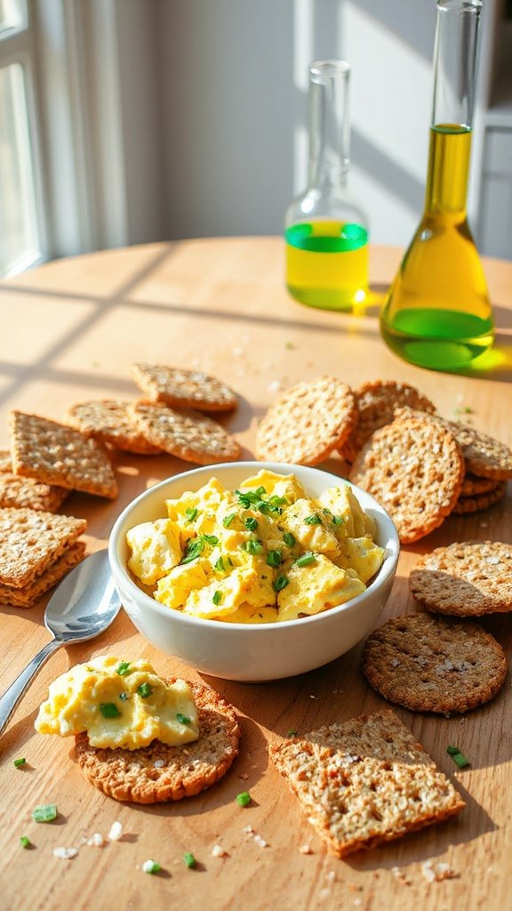 - Serve the egg salad on top of whole grain crackers and enjoy!