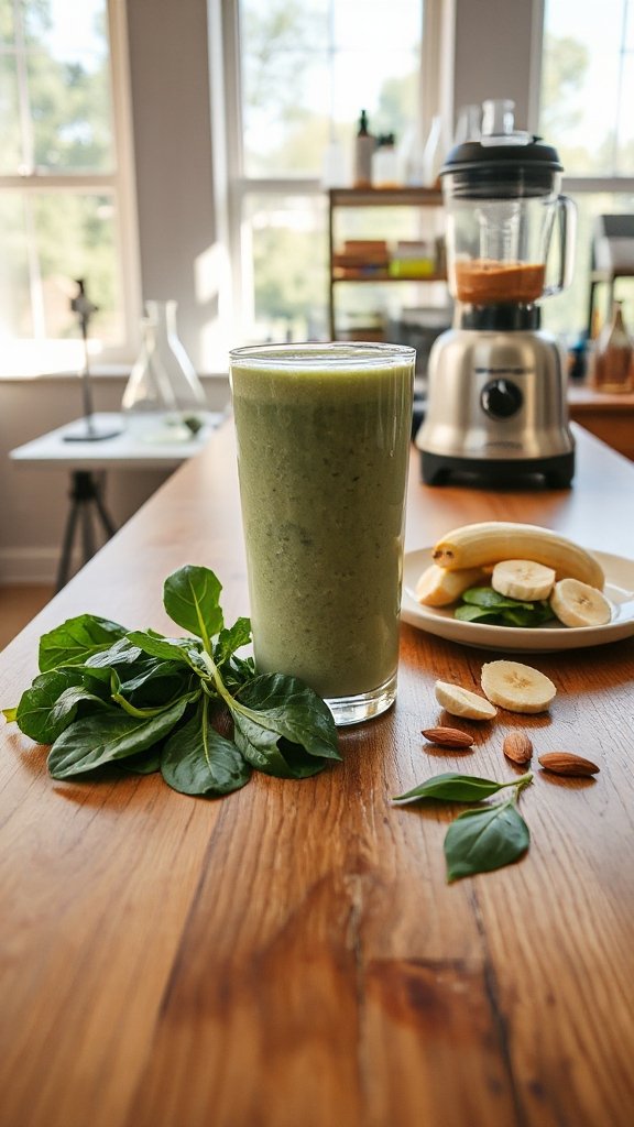 - In a blender, combine fresh spinach leaves, banana, almond butter, almond milk, and honey (if using).