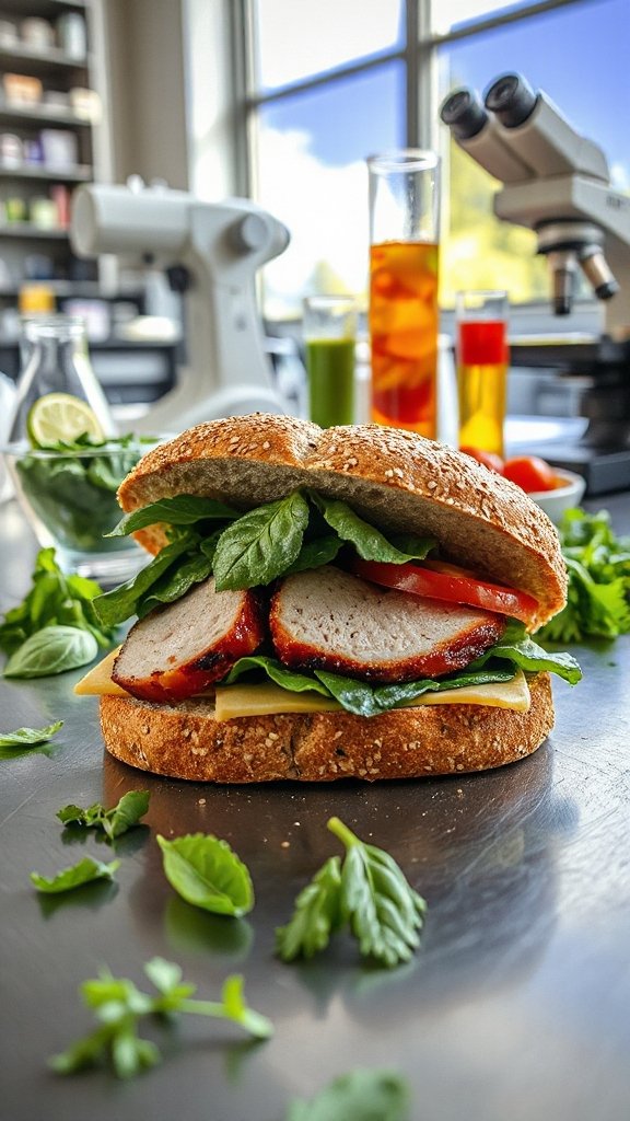 The Turkey and Spinach Sandwich on Whole Grain Bread is a hearty and nutritious lunch option perfect for those working in a laboratory setting. This sandwich features lean turkey breast, fresh spinach, and a spread of your choice, all sandwiched between slices of whole grain bread. It’s a convenient meal that can be prepared in advance and provides a great source of protein and fiber, essential for maintaining energy levels throughout the day.