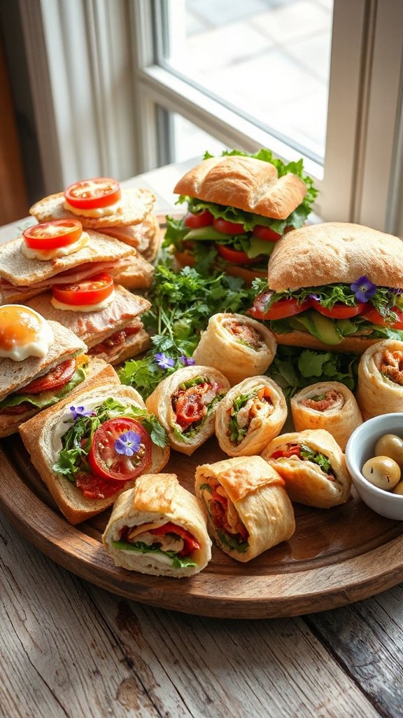 - Arrange all completed sandwiches on a platter, garnishing with mixed greens and drizzling with olive oil.