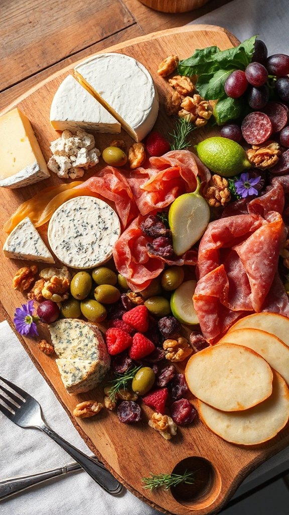 - Add small bowls or clusters of olives, dried fruits, and mixed nuts in the designated spaces on the board.