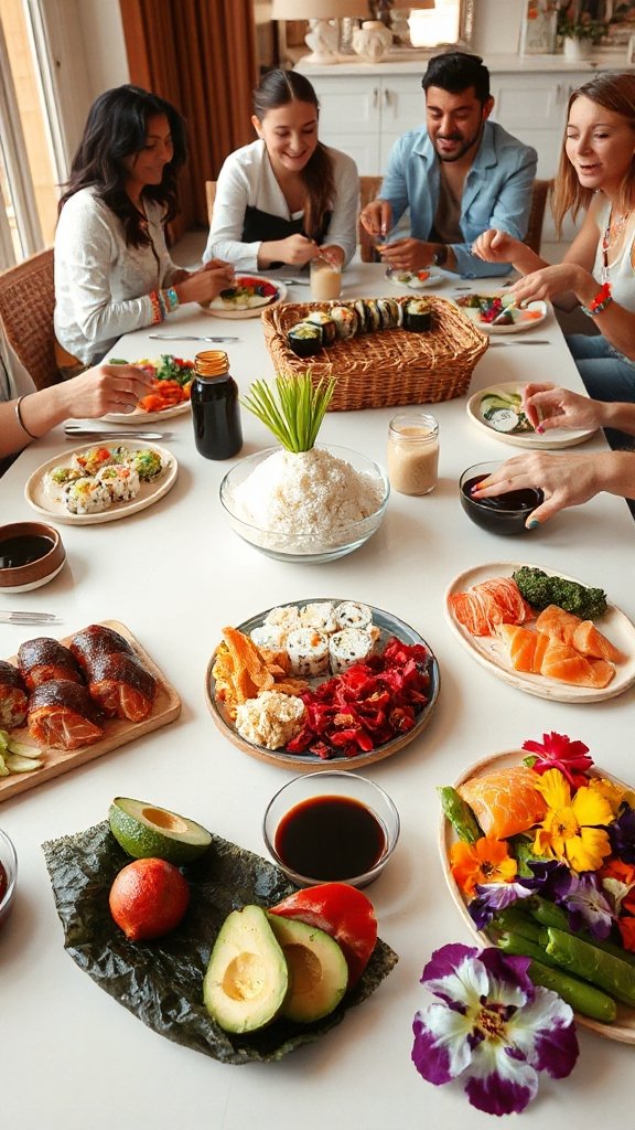 - Set up a sushi rolling station with a bamboo mat, bowls of sushi rice, nori sheets, and various fillings.