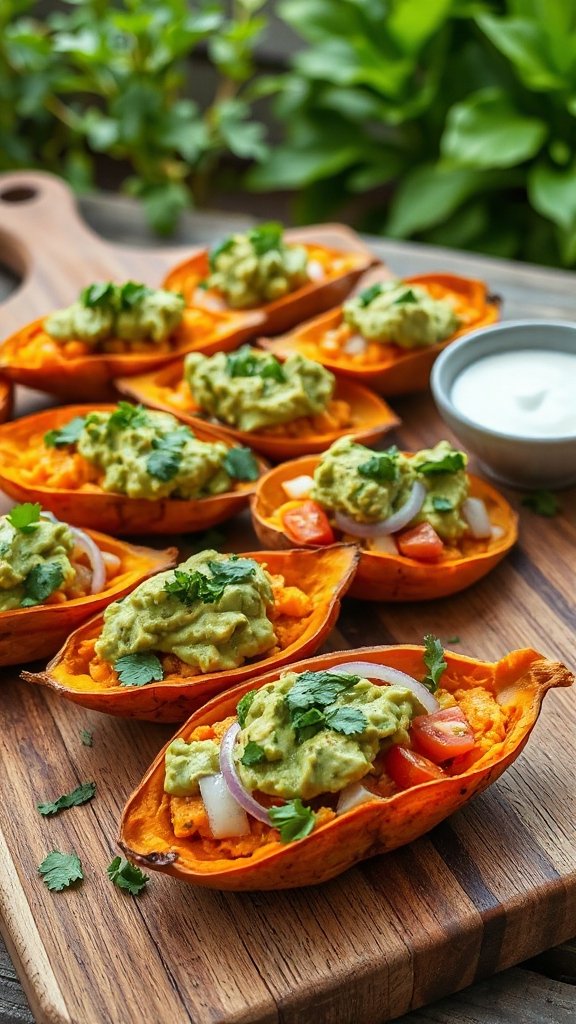 - Top with sour cream, green onions, and fresh cilantro before serving. Enjoy your delicious Loaded Sweet Potato Skins!