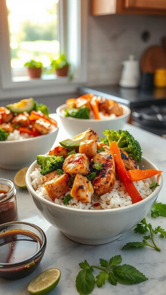- Garnish with chopped green onions and sesame seeds, if desired. Enjoy your nutritious Chicken and Veggie Rice Bowls!