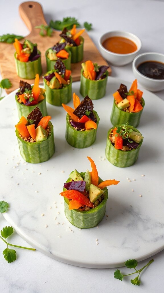 - Sprinkle sesame seeds over the vegetables and serve immediately or chill before serving. Enjoy your Rainbow Vegetable Sushi Cups!