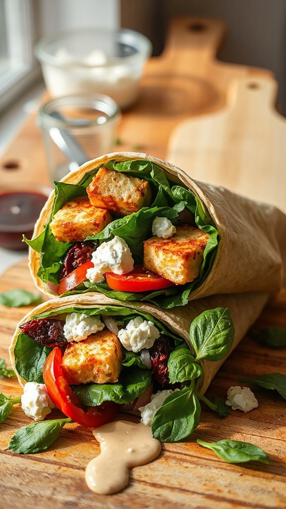 - Cut in half and serve. Enjoy your Mediterranean Tofu Wrap!