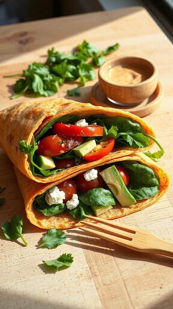 - If using, sprinkle feta cheese over the filling before rolling the wrap tightly from one end to the other.