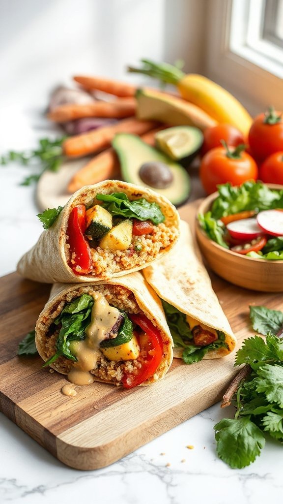 - Add chopped cilantro if desired, roll the tortilla tightly, slice in half, and enjoy your Grilled Vegetable and Quinoa Wrap!